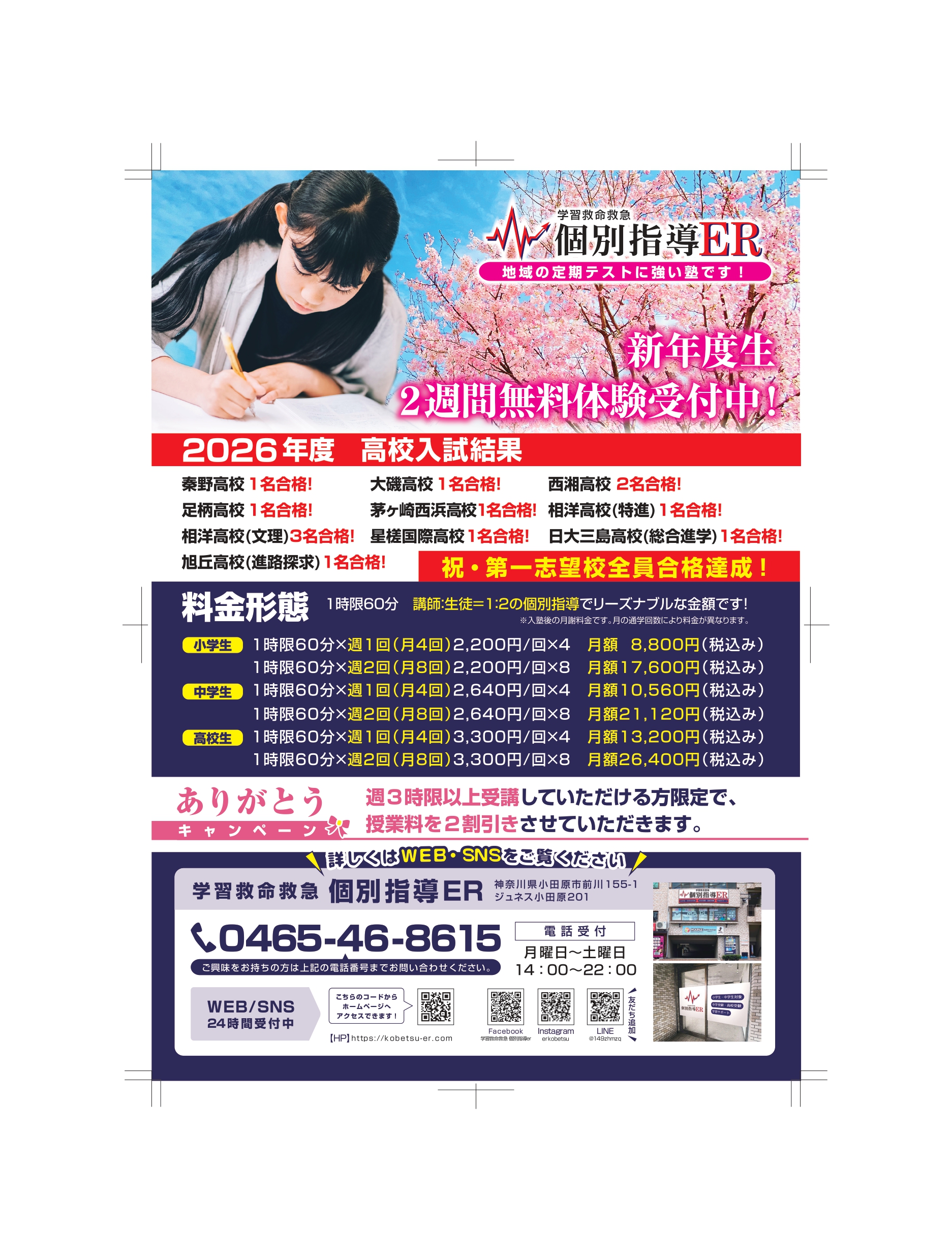 小田原市鴨宮の個別指導塾、個別指導ERです。